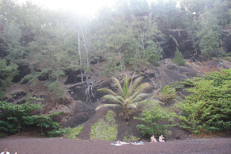 After visiting this beach, we got back in the car and finally drove into Hana! But there was one more beach we HAD to see while we were in this area. It is called Red Sand Beach. (Kaihalulu in Hawaiian) I will NEVER forget this beach! It was the hardest one to get to by far. Quite a slow hike on the side of a hill with loose red sand. Even before we started on the trail, a local showed us the beginning point and said, "be careful" with a worried look on her face! If I didn't have Justin's hand to hold on to, I wouldn't have made it. But we did and this is where we ended up.....