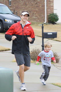 Justin and I go for jogs all the time. Sometimes we go by ourselves, and other times the kids want to ride in our jogger. One day, Justin said he was going for a run, and James said, "I want to go too, Daddy!" So Justin went outside to get the jogger ready thinking he wanted to ride. But inside, James was getting his running shoes on. He wanted to actually RUN with his Daddy ;)